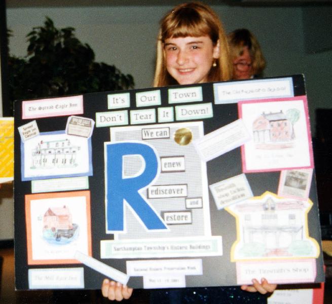 In an attempt to involve and educate the youth of our township, a poster contest was organized by the Northampton Township Historical Society, Committee for Historic Preservation to recognize National Preservation Week 2001, which was celebrated May 13 through 19. Students in the six Council Rock elementary schools located in Northampton Township were invited to participate. The National Trust Organization in Washington, D.C. designated this observance to create public awareness of the plight of historic buildings across the United States.Posters were required to emphasize the theme – “Restore, Renew, Rediscover Your Township’s Historic Buildings.” Students were urged to think about why it is important to save our historic buildings and asked to express their ideas on their posters. Judge Warren Hogeland, Police Chief Barry Pilla, and stone artist Larice Burtt selected the winning posters, which were displayed in Northampton Public Library.